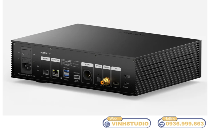 Eversolo T8 là Streaming Transport thuần tín hiệu số, hướng tới người dùng đã có DAC rời và muốn tối ưu chất lượng đầu vào. T8 trang bị đủ loại cổng xuất tín hiệu số chuyên nghiệp: USB Audio, HDMI-IIS, Coaxial, Optical, AES/EBU và cả SFP quang (chuẩn kết nối hiếm, thường gặp ở phân khúc hi-end.) T8 không tích hợp chip giải mã DAC bên trong, T8 hoạt động như bộ trung chuyển tín hiệu nhạc số độ chính xác cao, nhờ bộ tạo xung femtosecond để hạn chế jitter, giữ tín hiệu sạch và chuẩn xác khi cấp tín hiệu vào DAC ngoài.