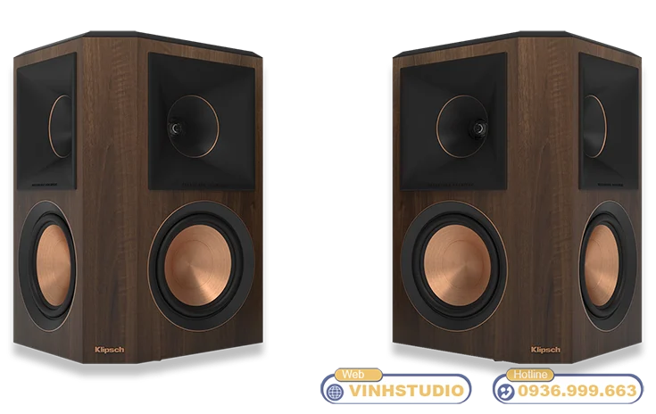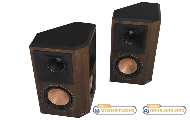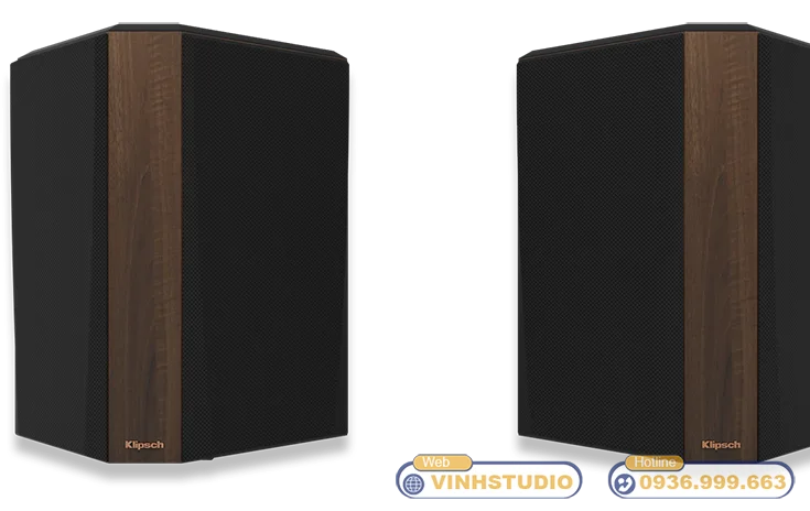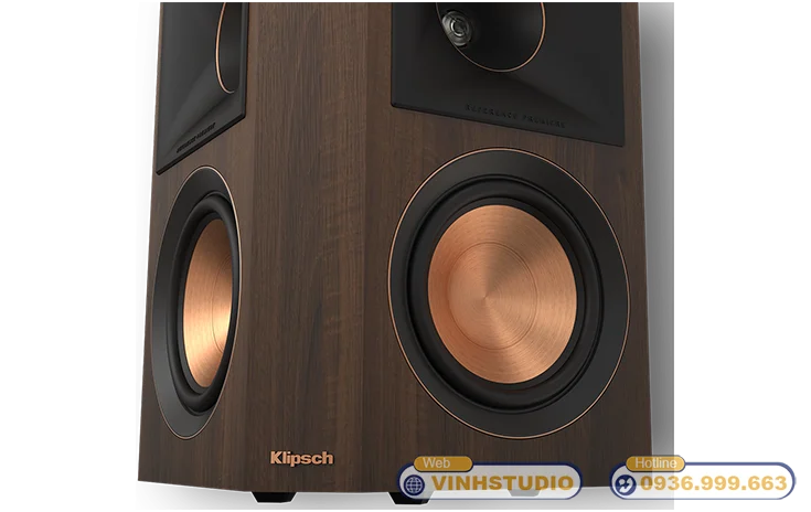 Bề mặt được phủ lớp Veneer vân gỗ liền mạch dạng xước dăm, có khả năng chống bụi, chống trầy xước và chống ẩm hiệu quả. Ngay từ cái nhìn đầu tiên, người dùng có thể cảm nhận rõ sự cao cấp và tinh tế của mẫu Loa Klipsch chính hãng này. Điểm nhấn đặc trưng của thiết kế nằm ở viền đồng ánh kim bao quanh họng kèn Treble và củ loa Mid/Bass – chi tiết mang đậm phong cách thẩm mỹ cao cấp đặc trưng của dòng Klipsch RP series.