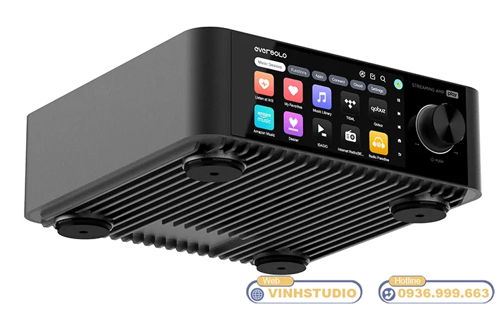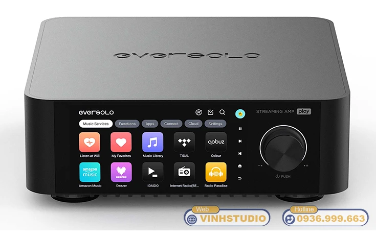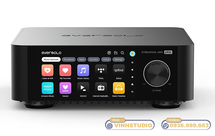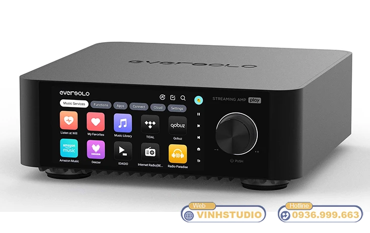 Eversolo Play (streaming amp / ampli nghe nhạc mạng) tích hợp sẵn các dịch vụ nhạc số phổ biến như TIDAL, Qobuz, IDAGIO, Amazon Music, TuneIn Radio, Presto Music, KKBOX, Radio Paradise, Deezer… Bạn có thể phát nhạc chất lượng cao trực tiếp trên thiết bị, không cần thêm đầu phát rời, nhờ đó trải nghiệm nghe trở nên đa dạng và sống động hơn.